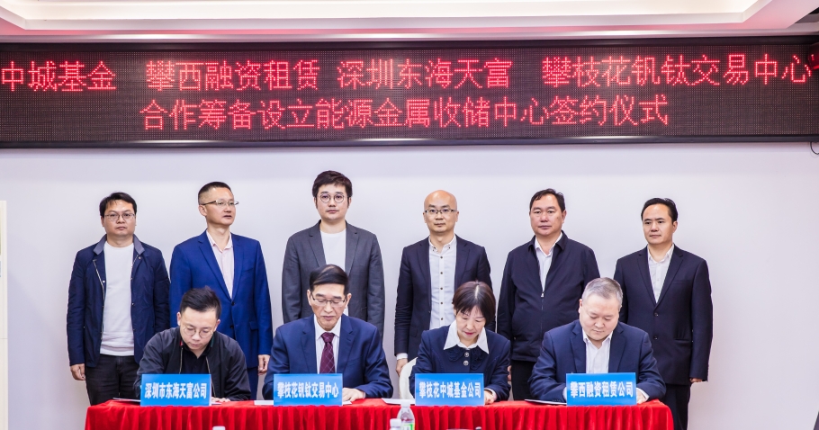 簽約儀式上,城建交通集團2家子公司——攀枝花中城股權投資基金管理有限公司、攀西融資租賃(上海)有限公司與天府商品交易所有限公司2家控股企業(yè)——攀枝花釩鈦交易中心有限公司、深圳市東海天富投資有限公司,共同簽署了《合作籌備設立能源金屬收儲中心協(xié)議書》,4家企業(yè)將發(fā)揮各自專業(yè)領域優(yōu)勢,充分利用手頭資源,合作設立能源金屬收儲中心,并依托釩鈦交易中心平臺,共同籌備組建國內首支能源金屬收儲基金,圍繞綠色能源產業(yè)鏈發(fā)電、儲電所需的釩、鈦、鋰、鎳等稀有金屬,用收儲、拋售的方式進行投資。此外,基金還將用于投資開展以釩液流電池為代表的綠色儲能設備、電池組件、電解液等租賃業(yè)務的設備租賃公司或介入租賃業(yè)務,通過融租方式降低儲能設施一次性建設成本,有效促進綠色儲能電池項目廣泛推廣。
