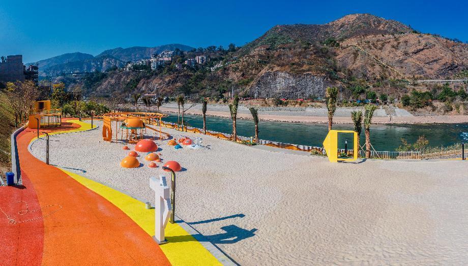 銀江湖公園項目首開區(qū)設計策略為串聯(lián)城與江,通過轉(zhuǎn)化生態(tài)價值、激活濱江空間,從而打造一個真正可以親水的濱江公園。首開區(qū)已完成342米濱江棧道和2200平方米的銀江沙灘以及兒童游樂區(qū)打造,集裝箱售賣亭、裝配式公廁、休閑座椅等配套設施均已安裝完畢。