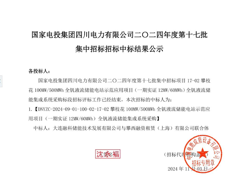 攀枝花城建交通(集團)有限公司旗下子公司攀西融資租賃(上海)有限公司(簡稱融租公司)與大連融科儲能技術(shù)發(fā)展有限公司作為項目聯(lián)合體,成功中標國家電投集團四川攀枝花100MW/500MWh全釩液流儲能電站示范應(yīng)用項目(一期實證12MW/60MWh)全釩液流電池設(shè)備采購,中標租賃物價值3390萬元,期限20年。